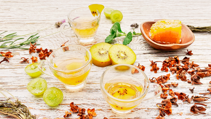 Hierve agua y añade las ramas de lavanda, hojas de salvia, flor de tila y uvas hechas puré. Deja que siga en hervor por dos minutos y deja reposar, cuela y sirve. Endúlzalo con miel o con tu endulzante preferido.