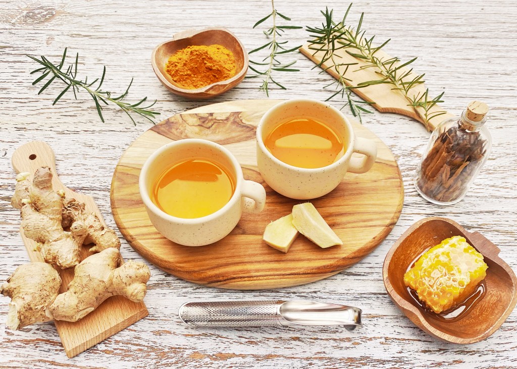Calienta el agua hasta que hierva y añade la canela, el jengibre rallado, la cúrcuma y el romero. Deja que repose unos minutos y cuela. La miel o tu endulzante preferido son opcionales.