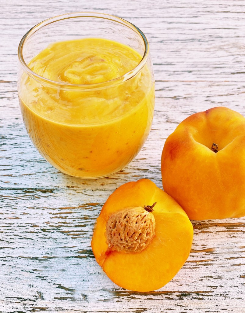 Lava y desinfecta perfectamente bien todo. Deshuesa los duraznos y dátiles, colócalos en la licuadora añadiendo la pulpa del aguacate, la canela y el jugo de limón. Mezcla con un poco de hielo y 150 ml de agua. Sirve enseguida y disfruta.