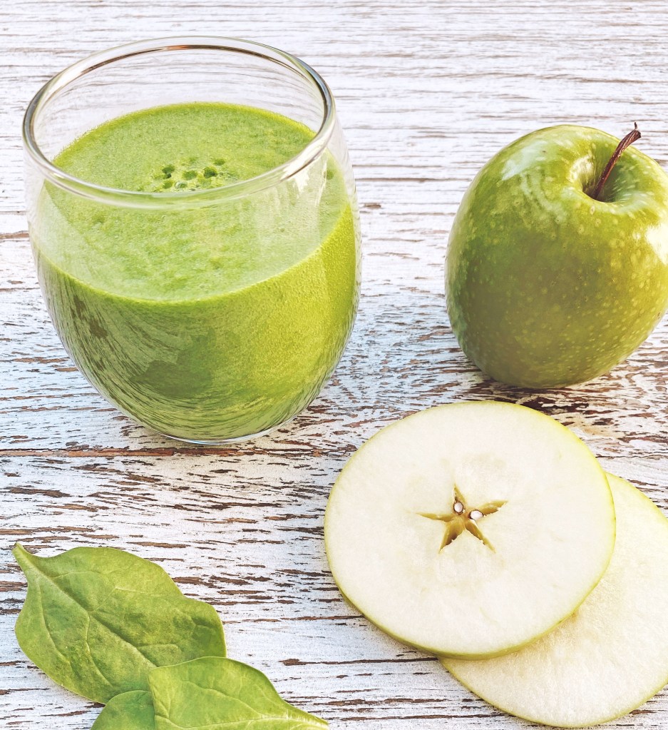 Lava y desinfecta perfectamente bien todo. Escurre y corta las hojas de la col, verdolagas y berros. Mete las manzanas en trozos en el extractor de jugos o licuadora, agrega todas las hojas y el jugo de limón. En caso de que utilices licuadora, cuela la mezcla antes de tomar.