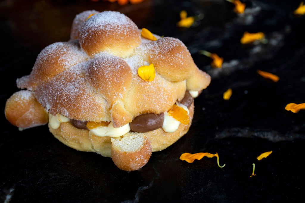 Arango, Cocina de Raíces, encabezado por el chef Alejandro Cuatepotzo, nos emociona no solo por su atención y la calidad de sus alimentos, si no por la estupenda vista que nos regala del Monumento a la Revolución, escenario perfecto para probar un pan de muerto hecho de forma tradicional, pero con un relleno único: crema de mandarina y chocolate especiado. Estos sabores brindan un interesante contraste en boca que resaltan las notas características del pan de muerto, que bien podemos acompañar con un carajillo de sus barra, elaborado a base del licor yucateco Xtabentún, bebida muy especial elaborada a partir de la miel de abejas que se alimentan justamente de la flor xtabentún.