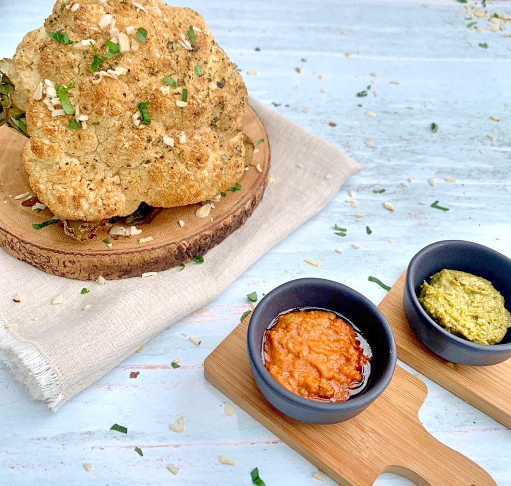 - En un refractario o charola coloca la coliflor boca abajo y, con ayuda de brocha, unta muy bien con la mezcla anterior. Deja que entre bien en los espacios del tallo. Volteala y cubre por completo sin dejar ninguna zona sin mezcla.