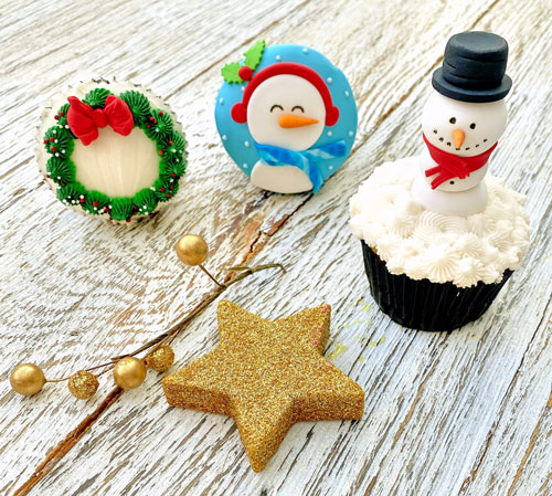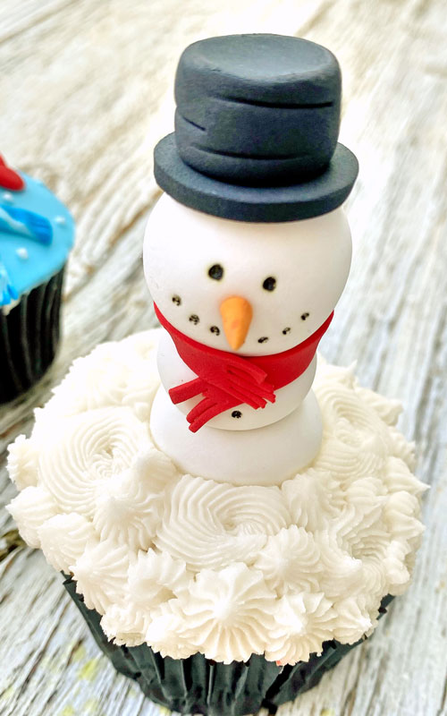 - Aplica el betún decorando todo el cupcake como base. Con el fondant blanco forma tres bolitas del mismo tamaño y pégalas con una gotita de agua, una con otra, y clávalas en el cupcake. Con el fondant negro arma el sombrero al gusto y pégalo, igual con un poco de agua. Forma la bufanda con una tira de fondant rojo y corta con una navaja las puntas y añádelo al muñeco. Con el plumón comestible forma la cara y puntos del cuerpo y, finalmente, la nariz con un poco de fondant naranja. Listo, deja secar y ¡a disfrutar!