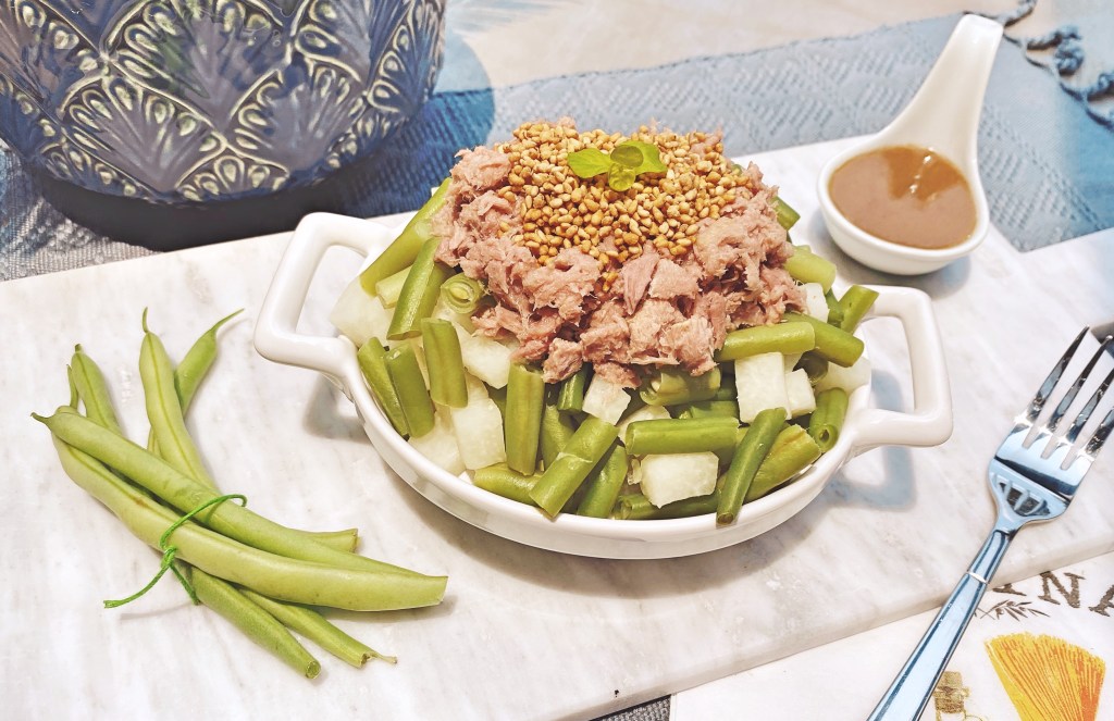 Ensalada de atún, ejotes, jícama y aderezo de miel y mostaza