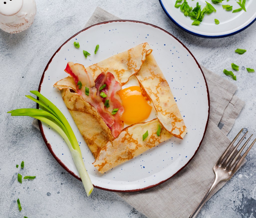 - Estira la crepa en un plato extendido y coloca en el centro el huevo, dobla la crepa hacia adentro logrando un cuadrado. Acomoda el tocino y espolvorea el cebollín.