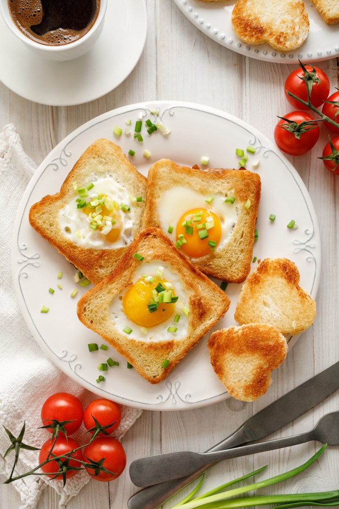 - En un sartén pon la mantequilla y coloca el pan –cortado previamente en el centro con el cortador de corazón. En caso de no conseguir el cortador, hazlo con un cuchillo logrando la figura–.
