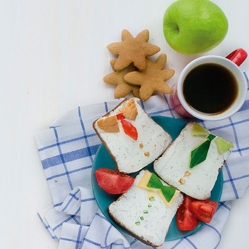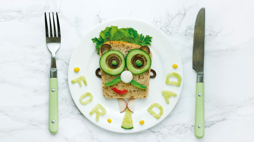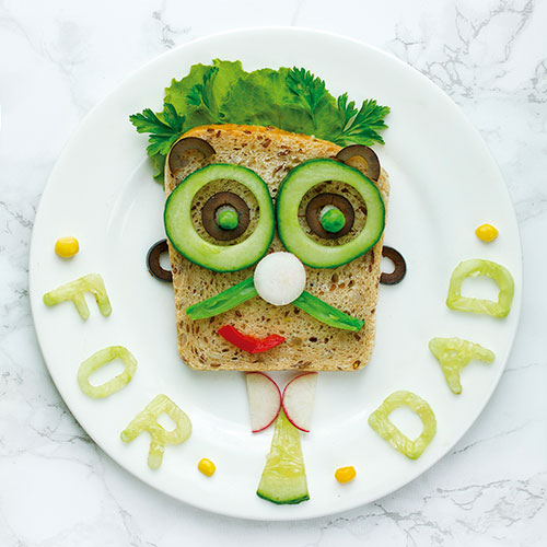 - Prepara el sándwich al gusto de papá, dejando por fuera la hoja de lechuga como cabello. Complementa con unas hojas de perejil. Luego, forma los ojos con dos rodajas de pepino con cáscara, con unos círculos en el centro. Acomoda las aceitunas siguiendo la forma de la foto, y coloca la nariz con una rebanada de rábano. Forma los bigotes y la corbata con pepino y rábano.