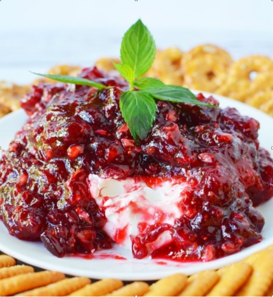 - En un plato, extiende el queso crema y agrega encima el dip de arándanos.