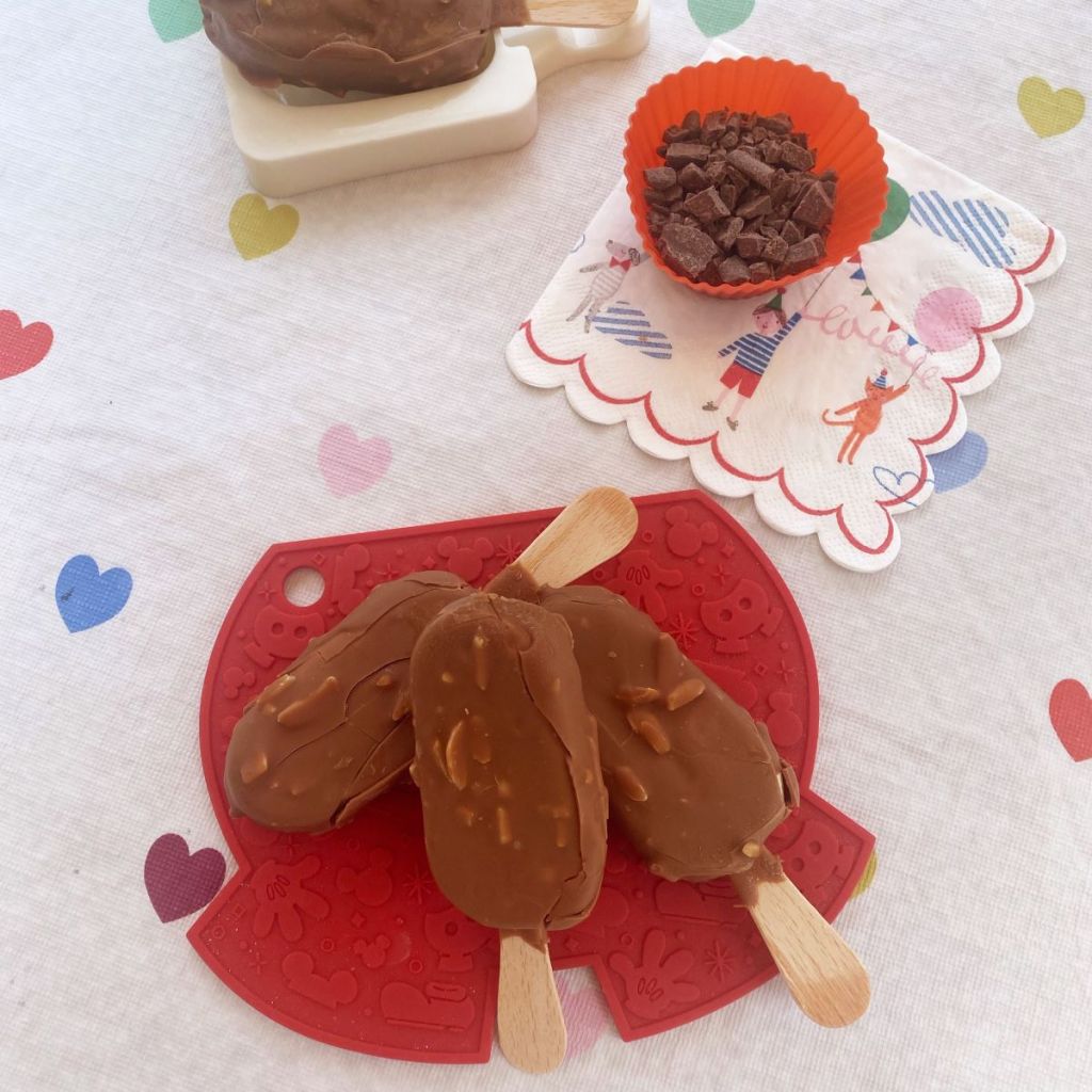 - Para la cubierta, pica el chocolate, agrega las almendras y el aceite de coco. Derrite en el microondas por 30 segundos. Mueve y repite hasta que esté líquido. Deja enfriar sólo un par de minutos en lo que desmoldas las paletas.