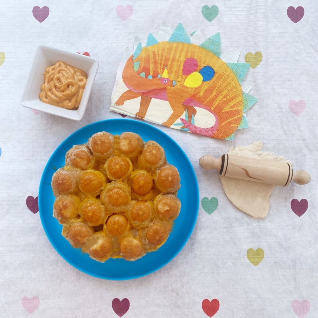 - Hornea a 180°C por 10 minutos o hasta que el hojaldre esté un poco dorado.Saca y deja enfriar un poco.
