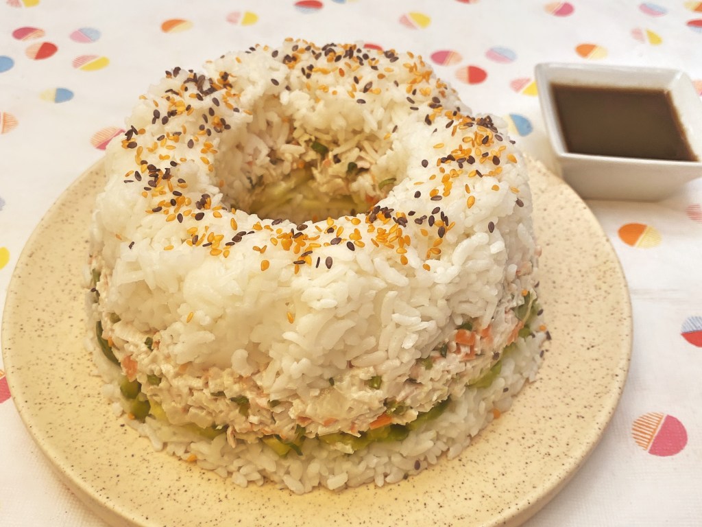 - En un molde de rosca engrasado, agrega una capa de arroz en el fondo, luego pepino. Acomoda la mezcla de tampico y el aguacate. Cuando esté todo bien acomodado, presiona con el resto del arroz. Coloca un plato encima y dale la vuelta para desmoldar.