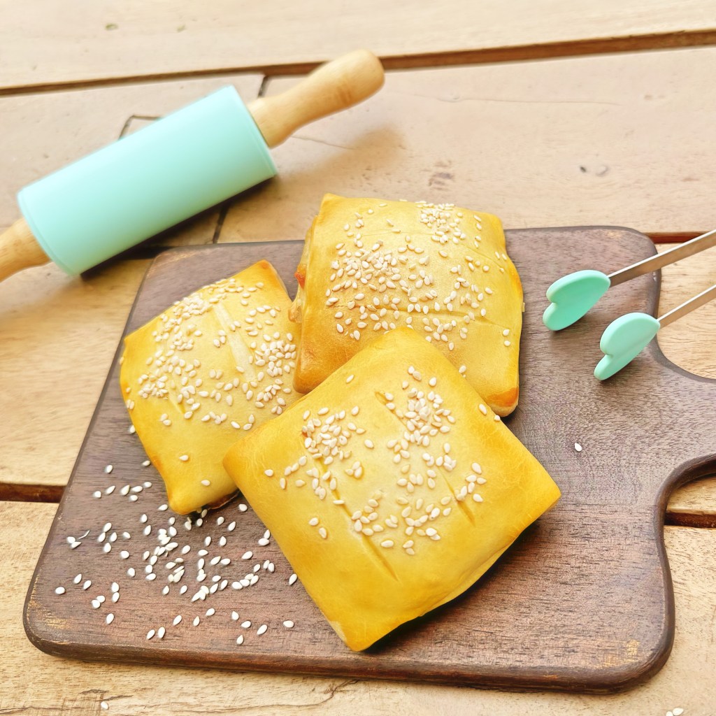 - Estira la masa sobre la mesa y corta líneas gruesas, del mismo grosor, en forma rectangular. Rellena con lo que más te guste, como jamón, queso, crema de avellana etc., colocando en el centro y dando un doblés de cada lado para lograr un pequeño cuadrado.
