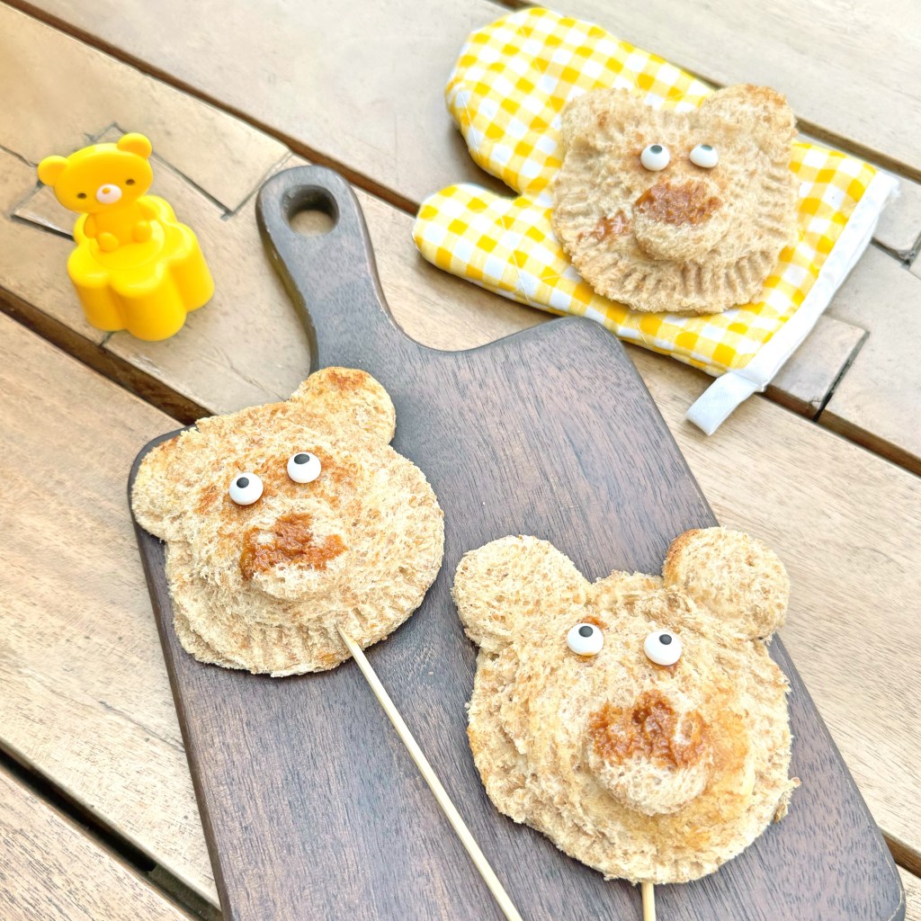 - En la hoja, marca con lápiz un osito, que quepa en la rebanada de pan. Recórtalo, y ese será tu molde para que, con ayuda de un cuchillo, cortes cada osito en cada rebanada de pan. Previamente, corta las orillas en línea, sin romperla, y reserva para la otra receta.