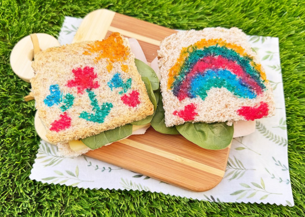 - Coloca los colorantes en cuatro recipientes con un pincel en cada uno. Deja que los niños suelten su imaginación y pinten sobre una rebanada de pan lo que quieren hacerle a papá. Después, pon a tostar el pan y arma el sándwich a tu gusto.