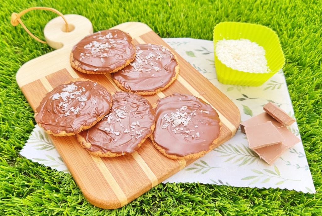 - Decora las galletas con una capa de chocolate y espolvorea coco rallado. Mete al refrigerador por 10 minutos y disfrútalas.