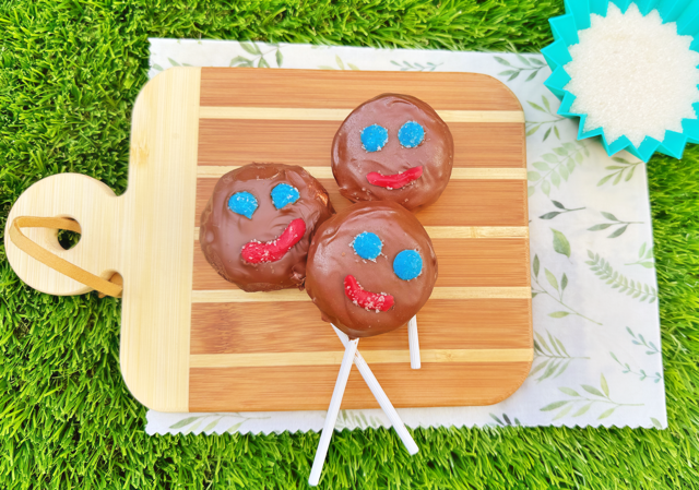 - Coloca los ojos y boca sobre cada dona y forma todas las paletas payaso. Refrigera por 10 minutos antes de consumirlas.