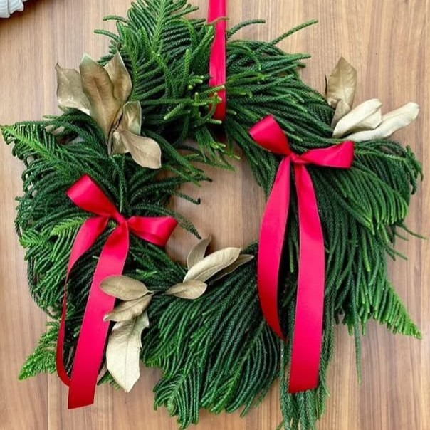 La corona navideña artesanal está realizada con follaje natural de pino y un acabado metálico, dorado o plateado, que podrás elegir de acuerdo con la decoración en tu hogar. También puedes personalizar el color del listón que decora la Corona Curly, entre verde, rojo o crudo. La corona tiene un tamaño entre 50 y 55 centímetros aproximadamente.