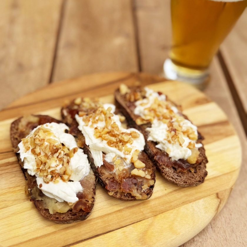 - Coloca encima un trozo de burrata, luego el tocino caliente y crujiente, y termina con la nuez.